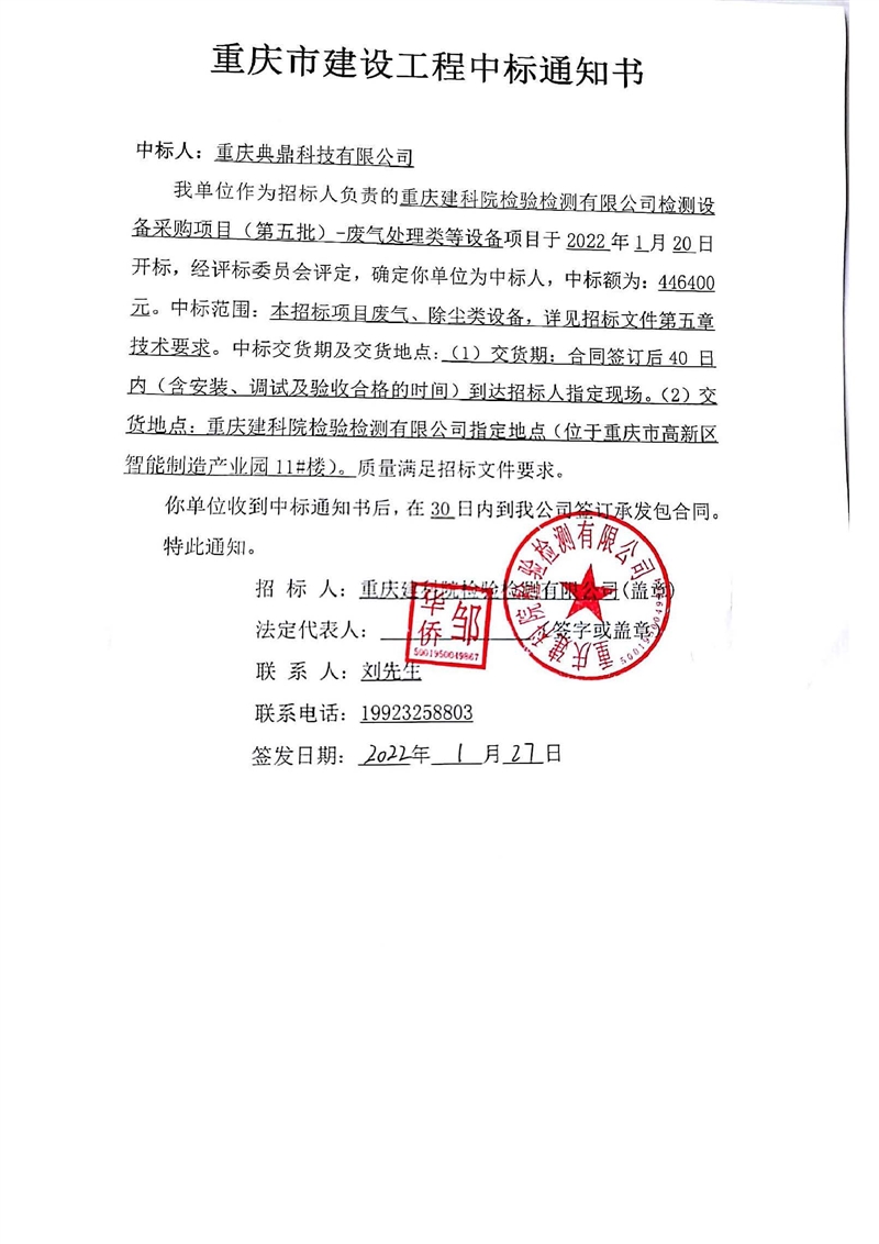 重慶建科院檢驗檢測有限公司委托重慶市工程管理有限公司對我公司檢測設備采購項目(項目號:CQEM-ZB-22002 )重慶建科院檢驗檢測有限公司檢測設備采購項目(第五批)-廢氣處理類等設備進行了公開招標采購,現(xiàn)已完成全部采購程序。確認重慶典鼎科技有限公司為檢測設備采購項目(第五批)-廢氣處理類等設備采購項目中標人,中標價為446400元(大寫:肆拾肆萬陸仟肆佰元整)。