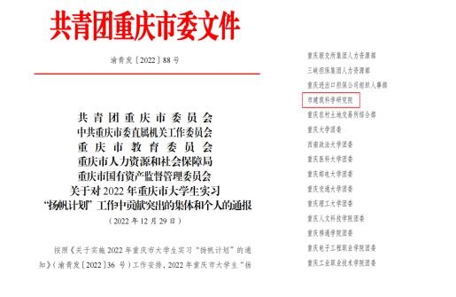 近日,市委直屬機(jī)關(guān)工委、市教委、市人力社保局、市國(guó)資委、團(tuán)市委對(duì)在 2022 年重慶市大學(xué)生實(shí)習(xí)“揚(yáng)帆計(jì)劃”工作中做出突出貢獻(xiàn)的 97 個(gè)組織、 95 名工作者以及表現(xiàn)出色的220 名優(yōu)秀學(xué)生進(jìn)行了通報(bào)。其中,重慶市建筑科學(xué)研究院有限公司(以下簡(jiǎn)稱公司)獲得貢獻(xiàn)突出組織稱號(hào),公司黨委辦公室實(shí)習(xí)學(xué)生程慶(重慶交通大學(xué))獲得表現(xiàn)出色個(gè)人稱號(hào)。