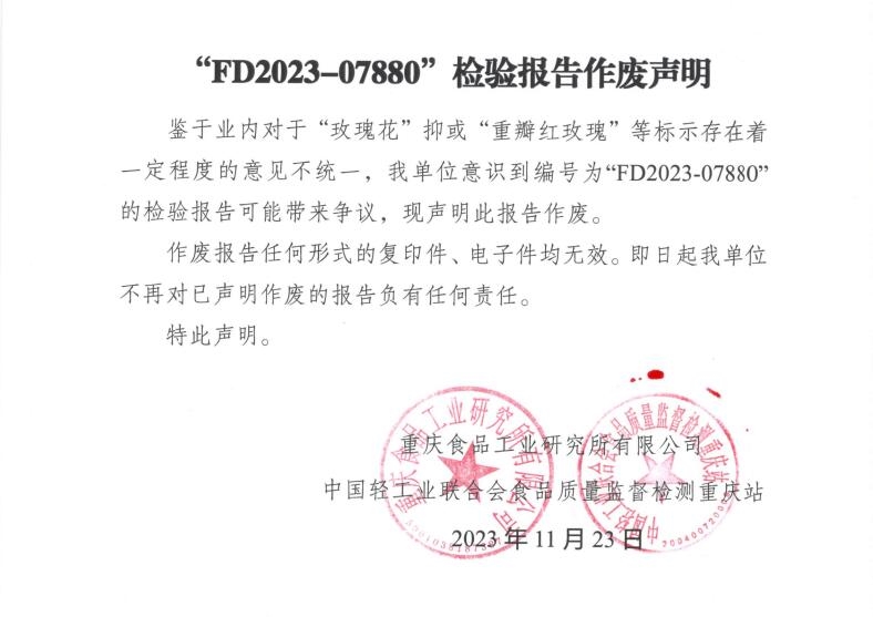 鑒于業(yè)內(nèi)對于“玫瑰花”抑或“重瓣紅玫瑰”等標(biāo)示存在著一定程度的意見不統(tǒng)一,我單位意識到編號為“FD2023-07880”的檢驗(yàn)報告可能帶來爭議,現(xiàn)聲明此報告作廢。