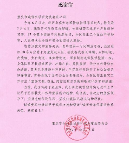 今年6月,重慶市萬州區(qū)五橋街道、長灘鎮(zhèn)等區(qū)域發(fā)生嚴(yán)重洪澇災(zāi)害,在防汛救災(zāi)的緊要關(guān)頭,市建科院公司第一時間響應(yīng)號召,緊急調(diào)派房屋鑒定專家團隊前往災(zāi)區(qū)開展搶險排險工作,晝夜奮戰(zhàn)完成了五橋街道、太白街道、周家壩街道、高筍塘街道、武陵鎮(zhèn)和長灘鎮(zhèn)等主要受災(zāi)區(qū)域共計440棟房屋的災(zāi)后隱患排查工作,充分展現(xiàn)了國企責(zé)任擔(dān)當(dāng),獲重慶市萬州區(qū)住房和城鄉(xiāng)建設(shè)委員會感謝信。