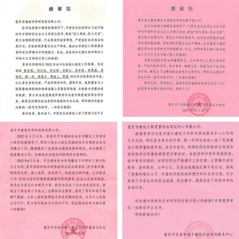 2023年,重慶設(shè)計集團市建科院公司全面貫徹落實黨的二十大精神,緊緊圍繞市委市政府戰(zhàn)略部署,在全面服務(wù)重慶城市建設(shè)發(fā)展中奮楫爭先、勇挑重?fù)?dān),先后收到重慶市住房和城鄉(xiāng)建設(shè)工程質(zhì)量安全總站、重慶市住房和城鄉(xiāng)建設(shè)行政審批服務(wù)中心、重慶市萬州區(qū)住房和城鄉(xiāng)建設(shè)委員會等十余個單位的數(shù)封感謝信、表揚信,信中充分肯定了市建科院公司2023年在重大工程建設(shè)、應(yīng)急搶險等方面所做的貢獻,并表達(dá)了誠摯的感謝。