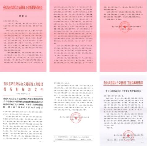 2023年12月至2024年1月,市建科院公司收到來自重慶東站鐵路綜合交通樞紐工程現(xiàn)場建設(shè)指揮部的3封感謝表揚信,對市建科院公司積極履行監(jiān)理單位職責(zé)、主動派員參與支援重慶東站建設(shè)、高效推進完成各關(guān)鍵性節(jié)點表示感謝,對我司李宗民、王波同志給予表揚。