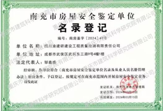 該項(xiàng)名錄登記單位資格的取得,標(biāo)志著四川渝建研公司在房屋安全鑒定領(lǐng)域的專業(yè)資質(zhì)和實(shí)力得到了南充市相關(guān)部門的認(rèn)可,公司將有更多機(jī)會參與到南充市各類房屋安全鑒定項(xiàng)目中,為更多客戶提供專業(yè)、高效的服務(wù)。