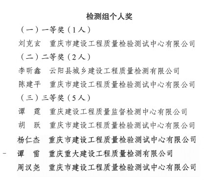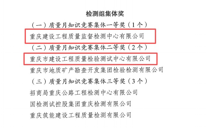市建科院所屬重慶建設(shè)工程質(zhì)量監(jiān)督檢測中心有限公司、重慶市建設(shè)工程質(zhì)量檢驗測試中心有限公司在檢測組比賽中表現(xiàn)突出,分別摘得檢測組集體獎一等獎和檢測組集體獎二等獎。