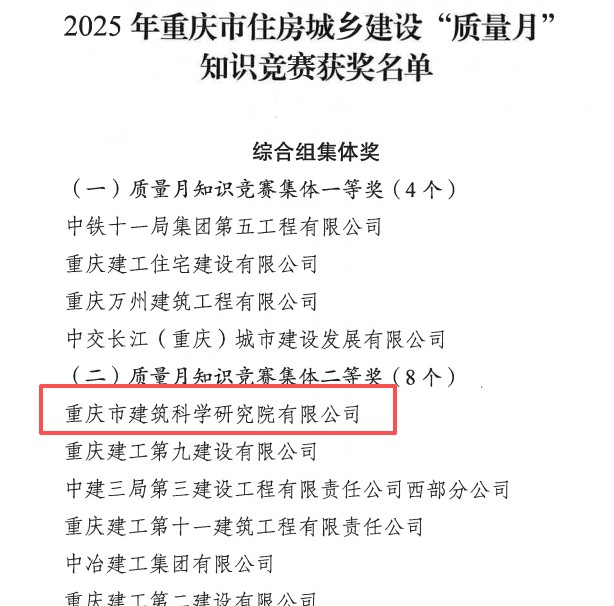 近日,重慶設(shè)計集團所屬子企業(yè)重慶市建筑科學研究院有限公司(以下簡稱“市建科院”)在參加重慶市住房和城鄉(xiāng)建設(shè)工程質(zhì)量安全總站、重慶市建設(shè)工程質(zhì)量協(xié)會組織開展的2025年重慶市住房城鄉(xiāng)建設(shè)“質(zhì)量月”知識競賽中,榮膺3項集體獎、8項個人獎。